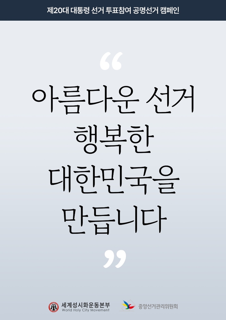▲ 세계성시화운동본부(대표회장 김상복 목사)는 17일부터 제20대 대통령 선거 투표 참여 및 공명선거 캠페인을 전개한다고 16일 밝혔다. 운동본부는 '아름다운 선거, 행복한 대한민국을 만듭니다'를 주제로 홍보스티커 배부, 카드뉴스 게시, 홍보영상 공유, 공명선거 세미나 등 온·오프라인에서 다양한 활동을 벌인다. (서울=연합뉴스)