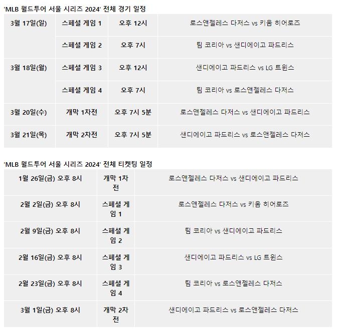 3월 20일과 21일 열리는 다저스와 샌디에이고의 MLB 개막 2연전은 모두 오후 7시 5분에 시작하고, 스페셜 게임을 포함한 모든 경기는 고척 스카이돔에서 열린다.