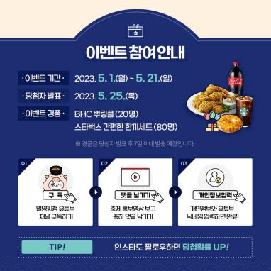 밀양시는 오는 21일까지 밀양아리랑대축제 홍보 영상에 축하 댓글을 단 밀양시 공식 유튜브 구독자를 뽑아 치킨 세트(20명), 커피 전문점 간편한 한끼세트(80명)를 선물로 준다.
