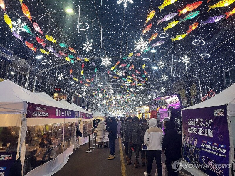| ▲ Visitors to the Hwacheon Sancheoneo Ice Festival walk on a road lined with booths under colorful lights in the northeastern county in Gangwon Province on Jan. 20, 2024. (Yonhap) |
