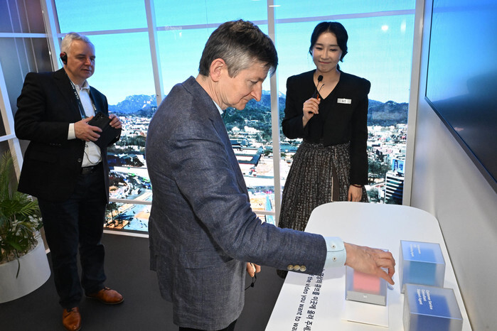 Benoit Torloting (C), CEO of France's third-largest carrier, Bouygues Telecom, visits the booth of South Korea's major telecom operator KT Corp. at the Mobile World Congress, the world's largest annual gathering of the mobile communications industry, in Barcelona on March 4, 2025. (Pool photo) (Yonhap)