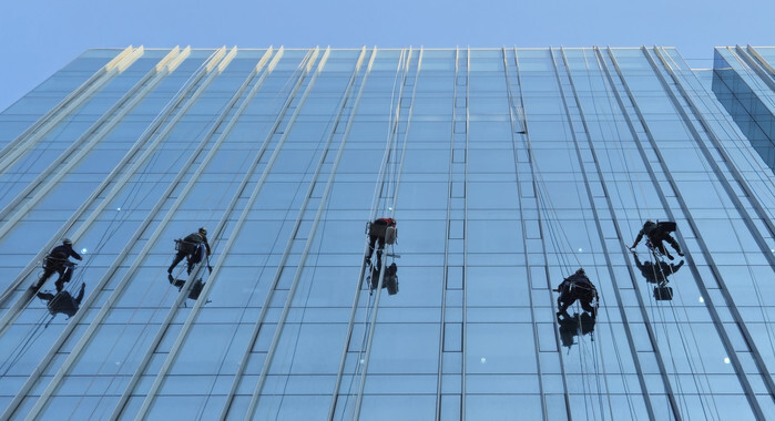 Workers, hanging from ropes suspended from the top of a building, clean glass panes on an exterior wall in Seoul's Jongno Ward on April 7, 2025. (Yonhap)