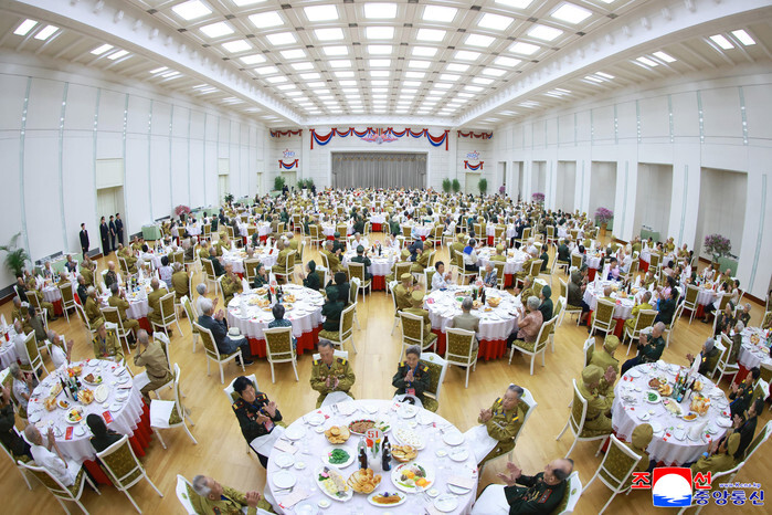 North Korean people take part in a banquet with war veterans at a restaurant in Pyongyang on July 27, 2025, to celebrate the 72nd anniversary the same day of the armistice that halted the 1950-53 Korean War, in this photo released by the North's official Korean Central News Agency the next day. North Korea refers to the three-year conflict as the Great Fatherland Liberation War and designates the date of the armistice signing as Victory Day. (For Use Only in the Republic of Korea. No Redistribution) (Yonhap)