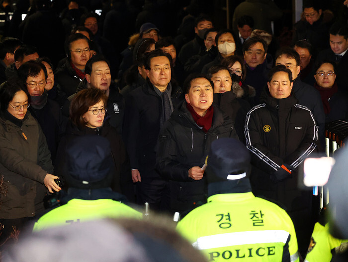Kim Gi-hyeon (3rd from L, 1st row) and other lawmakers of the ruling People Power Party gather at the entrance of impeached President Yoon Suk Yeol's official residence in Seoul on Jan. 15, 2025, in protest of police and the anti-corruption agency's second attempt to execute a warrant to detain Yoon over his short-lived imposition of martial law. (Yonhap)