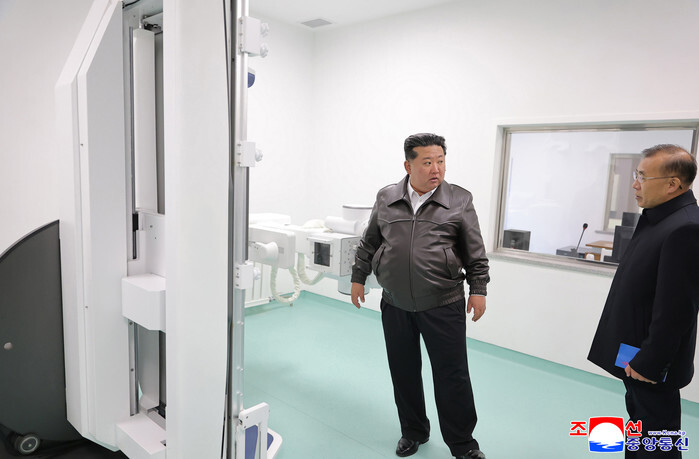 North Korean leader Kim Jong-un (L) inspects Kangdong County Hospital on the outskirts of Pyongyang on Nov. 19, 2025, as he attends its inauguration ceremony, in this photo released by the North's official Korean Central News Agency the next day. (For Use Only in the Republic of Korea. No Redistribution) (Yonhap)