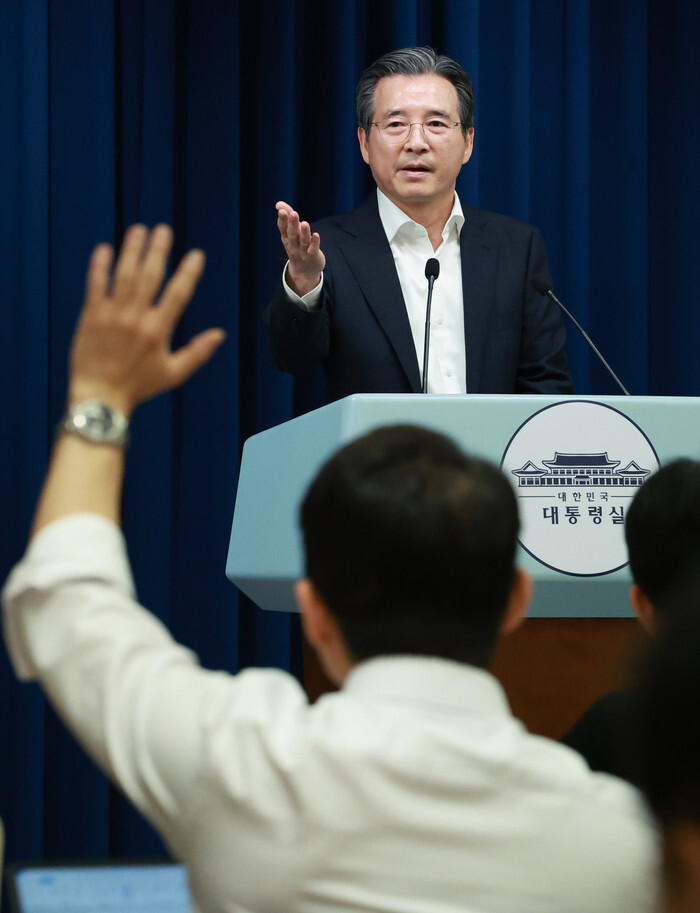Kim Yong-bum, the presidential chief of staff for policy, gestures to a reporter during a press briefing at the presidential office in Seoul on July 31, 2025, following reports that U.S. President Donald Trump's administration has agreed to lower "reciprocal" tariffs on South Korea to 15 percent from the proposed 25 percent in return for massive investments and market opening, and hold a summit with President Lee Jae Myung at the White House in two weeks. (Yonhap)