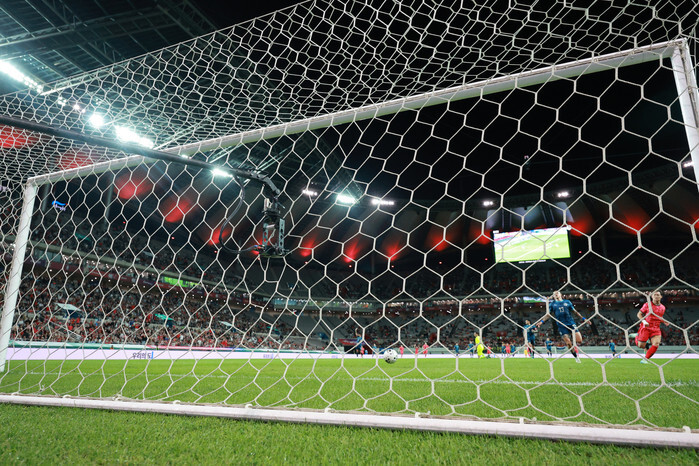 Oh Hyeon-gyu (R) of South Korea scores the team's second goal in the second half of an international friendly against Paraguay at Seoul World Cup Stadium in Seoul on Oct. 14, 2025. South Korea won the match 2-0. (Yonhap)
