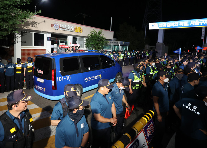 A justice ministry vehicle carrying former President Yoon Suk Yeol drives into the Seoul Detention Center in Uiwang, south of Seoul, on July 9, 2025, after Yoon attended a hearing at a court in the capital city to review the legality of his detention over charges related to his failed attempt to impose martial law. The court issued a warrant, requested by special counsel Cho Eun-suk, to arrest Yoon, placing him in custody for the second time. (Yonhap)