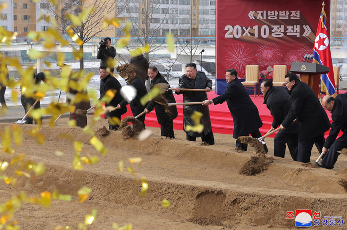 North Korean leader Kim Jong-un (5th from R) takes part in a groundbreaking ceremony in Kangdong County, Pyongyang, on Feb. 6, 2025, for the construction of a hospital and a general service center, in this photo released by the North's official Korean Central News Agency the next day. (For Use Only in the Republic of Korea. No Redistribution) (Yonhap)