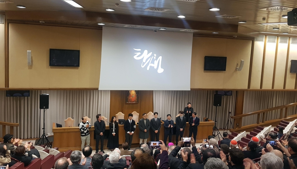 | ▲ 영화 '탄생' 바티칸 교황청 시사회 (바티칸=연합뉴스) 박수현 통신원 = 16일 오후(현지시간) 바티칸 교황청 뉴 시노드 홀에서 영화 '탄생' 시사회가 열렸다. 영화가 끝난 뒤 박흥식 감독과 배우 윤시윤 등 주·조연 배우들이 관객들에게 인사하고 있다. 2022.11.17 celina@yna.co.kr |