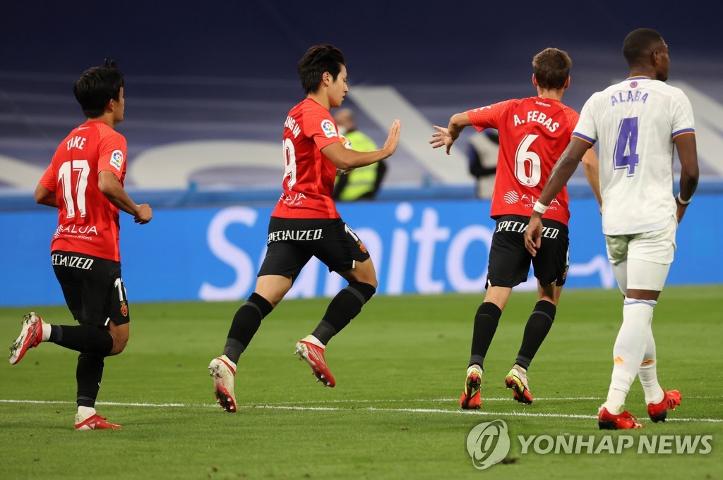 이강인은 23일(한국시간) 스페인 마드리드의 산티아고 베르나베우에서 열린 2021-2022시즌 스페인 프리메라리가 6라운드 원정경기에 선발 출전해 마요르카가 0-2로 끌려가던 전반 25분 왼발 중거리 슛으로 만회골을 터트렸다.