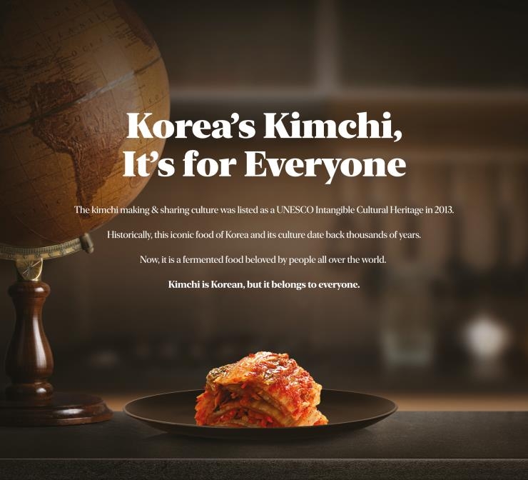 이번 광고는 최근 중국이 김치를 자신들의 문화로 왜곡하는 이른바 '김치 공정'에 대항하기 위해 진행됐다.