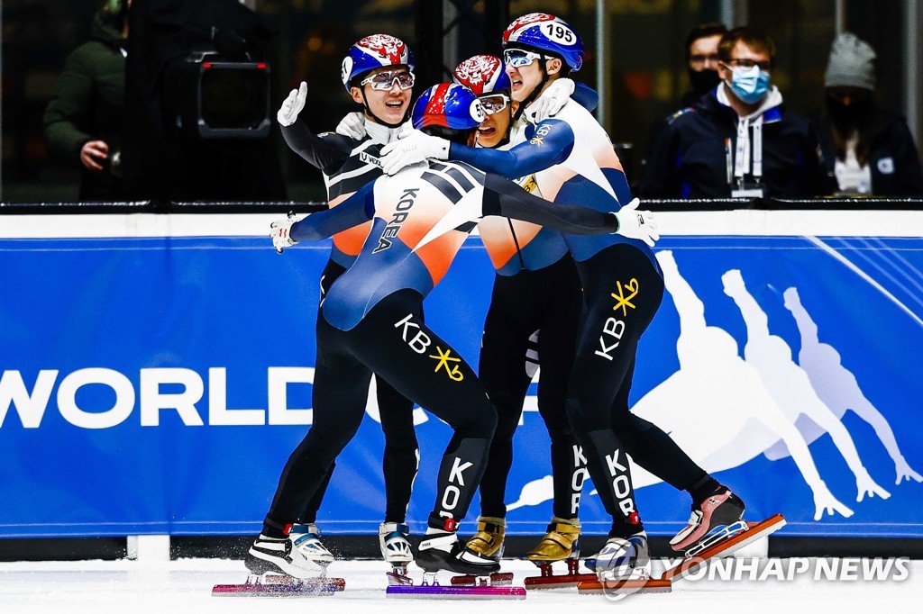 | ▲  In this EPA file photo from Nov. 28, 2021, members of the South Korean men's 5,000m relay team celebrate their gold medal at the International Skating Union Short Track Speed Skating World Cup at Sportboulevard Dordrecht in Dordrecht, the Netherlands. (Yonhap) |