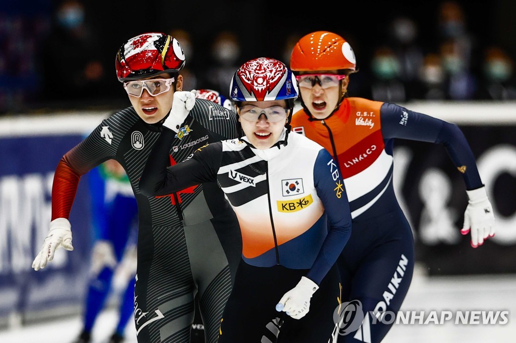 | ▲  In this AFP file photo from Nov. 28, 2021, Choi Min-jeong of South Korea (L) takes the women's 1,000m title at the International Skating Union Short Track Speed Skating World Cup at Sportboulevard Dordrecht in Dordrecht, the Netherlands, on Nov. 28, 2021. (Yonhap) |