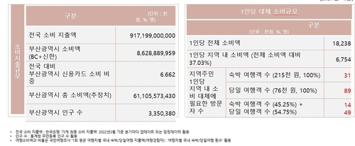 12일 연합뉴스가 한국관광공사에 의뢰해 받은 자료에 따르면 지난해 기준 부산시민 연간 총 소비액은 61조 원이고 이를 인구수(335만명)로 나누면 1인당 평균 소비액은 1천823만원이다.