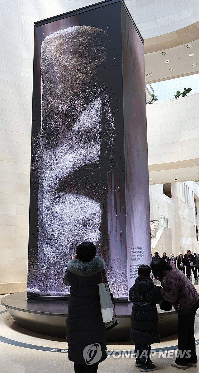 | ▲ 국립중앙박물관, 광개토왕비 디지털 영상으로 재현 (서울=연합뉴스) 이지은 기자 = 24일 서울 용산구 국립중앙박물관 상설전시관 '역사의 길'에 디지털로 재현한 광개토대왕릉비가 전시돼 있다. 박물관에서 새롭게 태어난 비석은 중국 지안(集安)에 있는 유물 모습 그대로로 높이 7.5m(받침대 포함 시 8m), 너비 2.6m 크기의 발광다이오드(LED) 기둥에는 사진과 영상 자료를 토대로 구현한 비석 모습을 각 면에서 볼 수 있다. 2024.1.24 jieunlee@yna.co.kr |