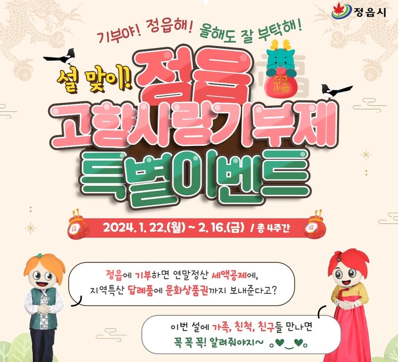 (정읍=연합뉴스) 김동철 기자 = 전북 정읍시는 설 명절을 앞두고 고향사랑기부제 이벤트를 한다고 23일 밝혔다.