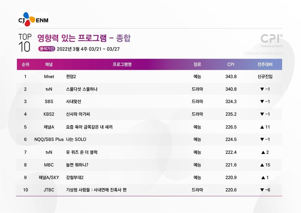 ☞ CPI 지수 = 지상파, 종합편성채널, 케이블 등 29개 채널 프라임 시간대 방송 드라마, 연예·오락, 음악, 인포테인먼트 프로그램을 대상으로 시청자 행동을 파악하는 지표. 방송통신위원회 방송콘텐츠가치정보분석시스템(RACOI)을 통해 주간 단위로 프로그램 관련 시청자 데이터(동영상 조회수, 게시글수, 댓글수)를 수집해 200점 기준 표준점수로 환산해 평균을 산출한다.