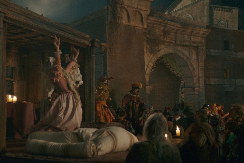 (서울=연합뉴스) 박원희 기자 = 16세기 후반 이탈리아 로마의 어느 뒷골목에서 난장의 밤이 지나고 있다. 연극이 진행되는 와중에 무대 밑에서는 섹스가 이뤄지고 온갖 사람들이 모여 술을 마시고 춤을 춘다. 개중엔 미켈란젤로 메리시(리카르도 스카마르치오)도 있다.