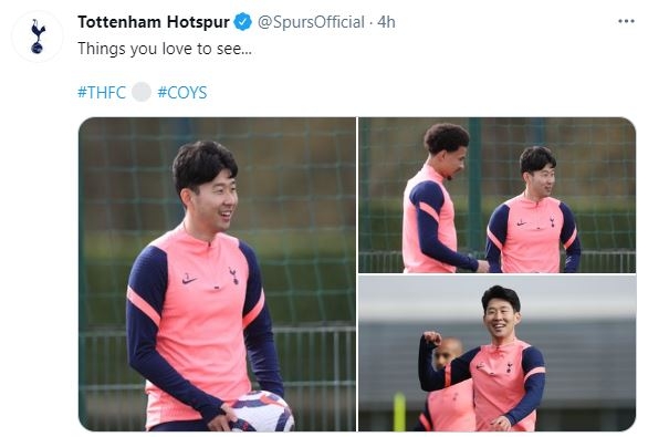 토트넘 구단은 2일 트위터를 통해 손흥민의 훈련 사진을 공개했다. 수염을 기른 그는 밝은 표정으로 동료들과 팀 훈련을 소화했다.