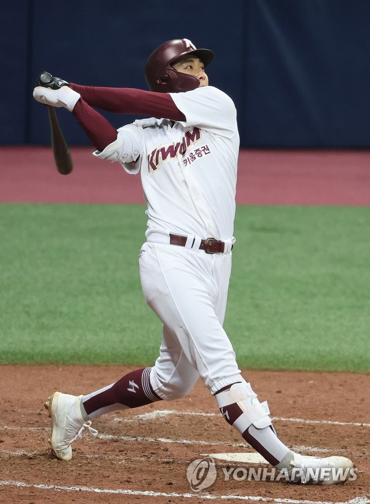 | ▲  In this file photo from March 17, 2022, Lee Jung-hoo of the Kiwoom Heroes hits an RBI single against the SSG Landers during the bottom of the sixth inning of a Korea Baseball Organization preseason game at Gocheok Sky Dome in Seoul. (Yonhap) |
