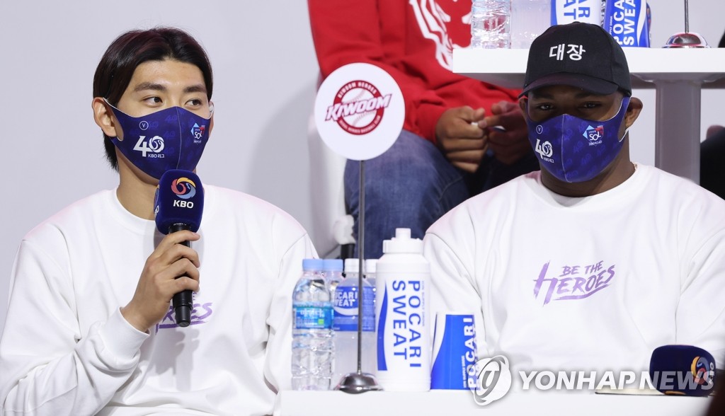 | ▲  Lee Jung-hoo of the Kiwoom Heroes (L) speaks during the Korea Baseball Organization media day at the Grand Hyatt Seoul in Seoul on March 31, 2022. (Yonhap) |