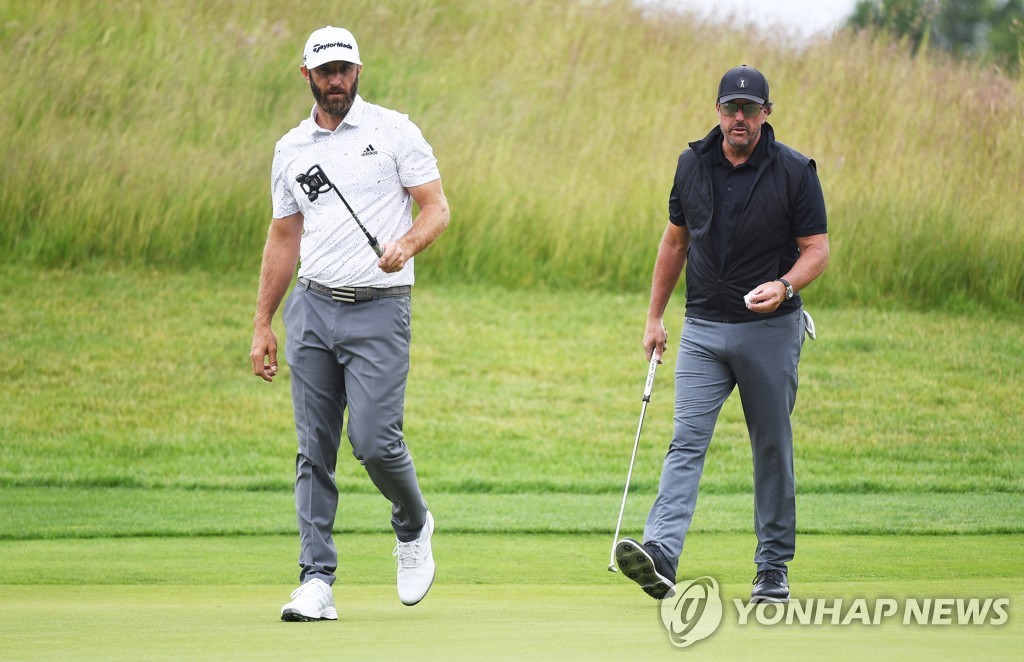 | ▲ 1라운드 4번 홀 퍼트 준비하는 더스틴 존슨과 필 미컬슨 [EPA=연합뉴스] |