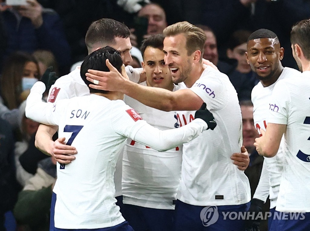 ▲ 손흥민(왼쪽)과 마주보며 기뻐하는 케인(오른쪽 세 번째) [로이터=연합뉴스]
