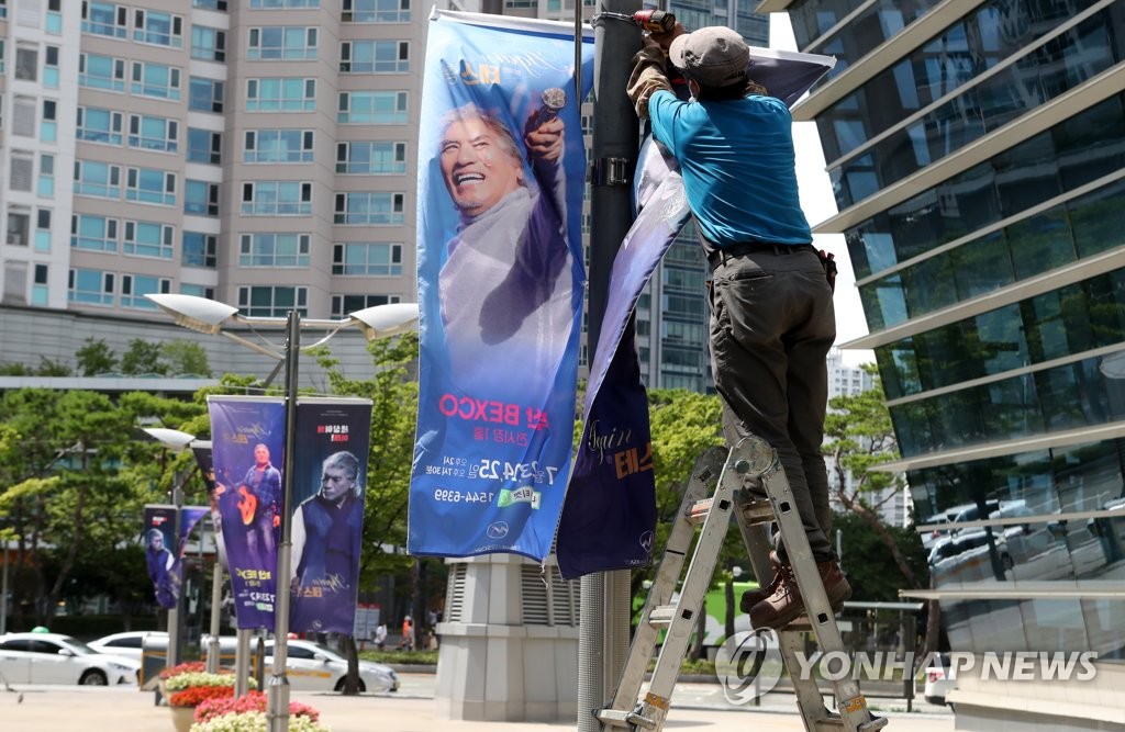 | ▲ 비수도권 공연 금지…테스형 부산행사 연기 (부산=연합뉴스) 조정호 기자 = 지난 7월 22일 부산 해운대구 벡스코에서 가수 나훈아 공연 홍보 현수막이 철거되고 있다. 당초 23∼25일 예정된 '나훈아 어게인 테스형' 부산 콘서트는 비수도권 공연 금지에 따라 다음 달로 연기됐다. 2021.7.22 ccho@yna.co.kr[연합뉴스 자료사진] |