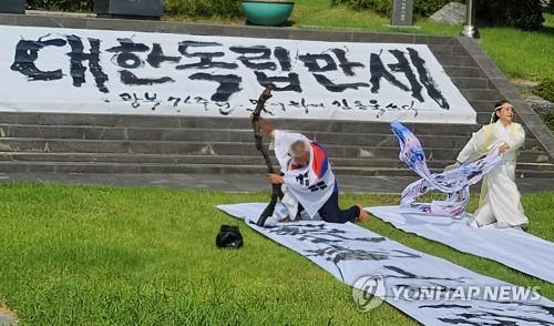 | ▲ 광복 기념 퍼포먼스 (포항=연합뉴스) 지난 12일 경북 포항시 북구 기계면 새마을운동발상지기념관 앞에서 서예가 김동욱씨와 이희숙 고살풀이춤보존회장이 광복 76주년을 앞두고 독립을 기념하고 독도 수호 의지를 다지는 서예 퍼포먼스를 하고 있다. [김동욱씨 제공·연합뉴스 자료사진. 재판매 및 DB 금지] |