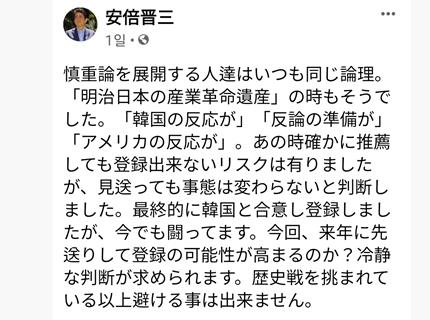 | ▲ 사도광산 세계유산 추천 강행을 주장하는 아베 전 총리의 글 아베 신조 전 총리가 27일 페이스북을 통해 사도광산 세계유산 후보 추천을 내년으로 미룬다고 해서 등재 가능성이 커지겠느냐고 반문한 뒤 한국이 '역사전'을 걸어온 이상 싸움을 피할 수 없다며 추천 강행을 주장하고 있다. [페이스북 캡처.재판매 및 DB금지] |