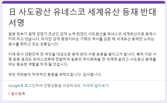| ▲ 사도광산 유네스코 세계문화유산 등재 반대 온라인 서명지 [서명지 캡처] |