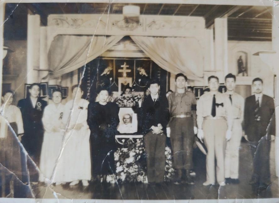 | ▲ 안중근 의사 차남인 안준생 장례식에 참석한 안 여사(왼쪽 4번째) [출처:안성녀오항선추모기념사업회] |