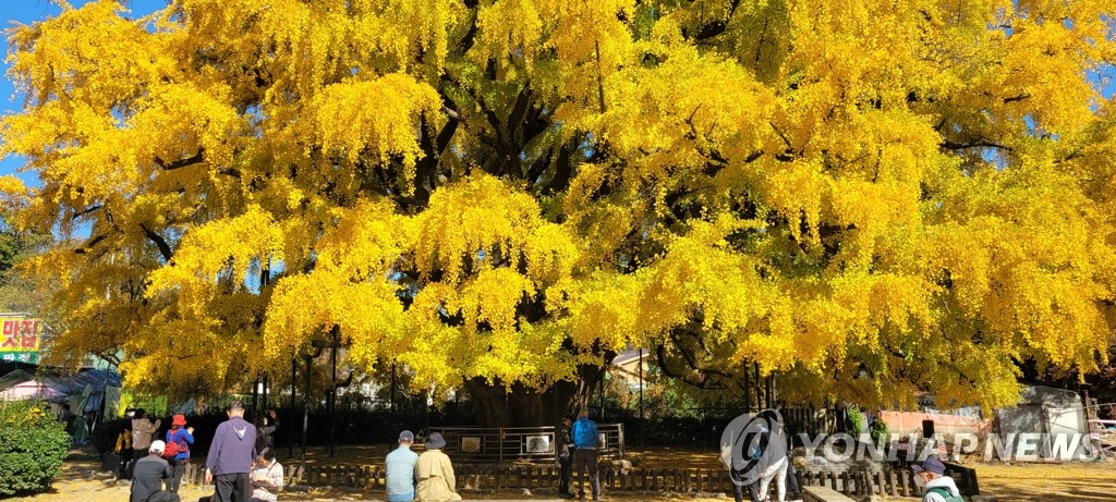 | ▲ 노란 자태 뽐내는 인천 장수동 은행나무 (인천=연합뉴스) 윤태현 기자 = 2일 오후 인천시 남동구 장수동 은행나무가 노랗게 물들어 자태를 뽐내고 있다. 이 은행나무는 높이 28m·둘레 9m 규모로 국가지정문화재 천연기념물 제562호로 지정됐다. 2022.11.2 tomatoyoon@yna.co.kr |