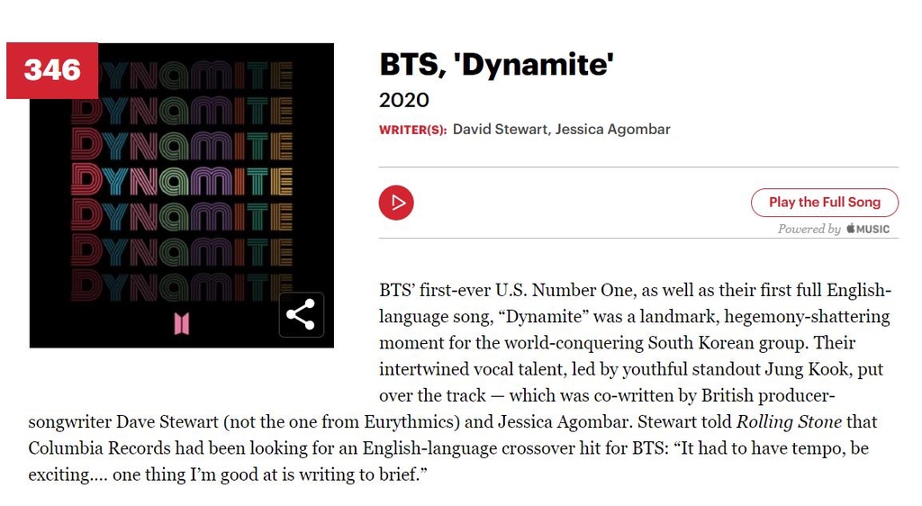| ▲ 롤링스톤 '베스트송 500'에 오른 BTS '다이너마이트' [롤링스톤 홈페이지 캡처, 재판매 및 DB 금지] |