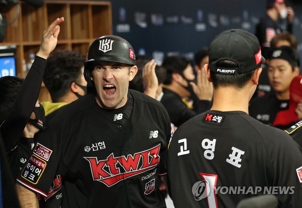 | ▲ Jared Hoying of the KT Wiz (L) celebrates his two-run home run against the Doosan Bears in the top of the eighth inning during Game 4 of the Korean Series at Gocheok Sky Dome in Seoul on Nov. 18, 2021. (Yonhap) |