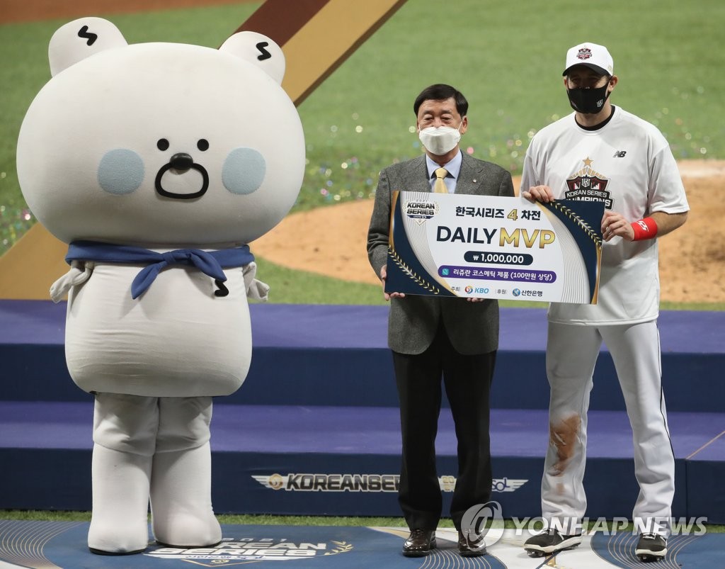 | ▲ Jared Hoying of the KT Wiz (R) poses with the sign showing him as the Player of the Game for Game 4 of the Korean Series against the Doosan Bears at Gocheok Sky Dome in Seoul on Nov. 18, 2021. (Yonhap) |