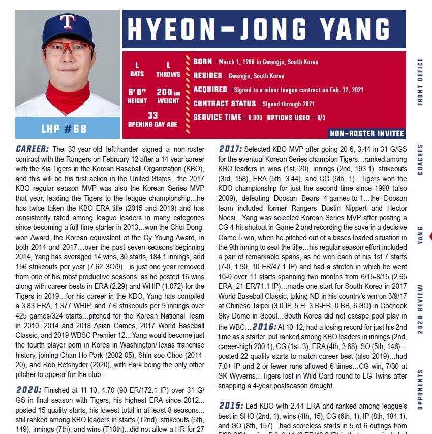 | ▲ 2021년 MLB 텍사스 구단의 미디어 가이드에 수록된 양현종 정보 [MLB 텍사스 레인저스 미디어가이드 캡처. 재판매 및 DB 금지] |