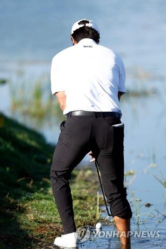 | ▲ 맨발로 물속에 발을 디디고 샷 하는 김성현. [AFP/게티이미지=연합뉴스] |