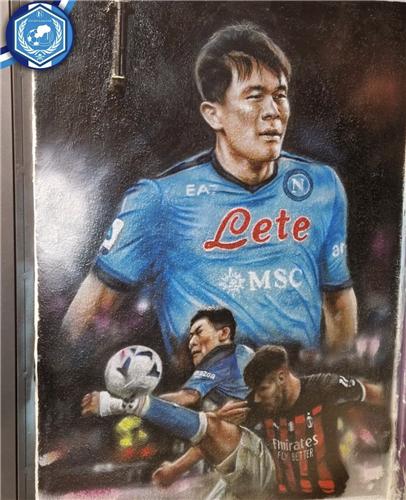 (서울=연합뉴스) 안홍석 기자 = 이탈리아 프로축구 세리에A 나폴리에서 맹활약하는 '괴물 수비수' 김민재(26)가 AC밀란을 상대로 보여준 절묘한 걷어내기 플레이가 '벽화'로 탄생했다.