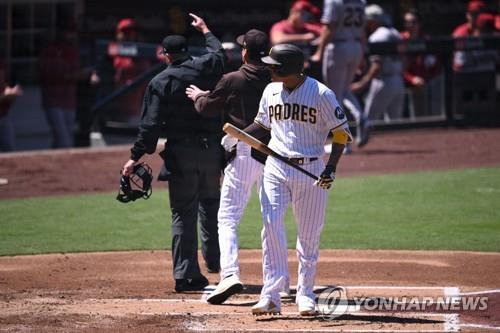 (서울=연합뉴스) 천병혁 기자 = 김하성(27·샌디에이고 파드리스)의 팀 동료인 매니 마차도가 미국프로야구 메이저리그(MLB)에서 '피치 클록'에 항의하다 퇴장당한 첫 선수가 됐다.