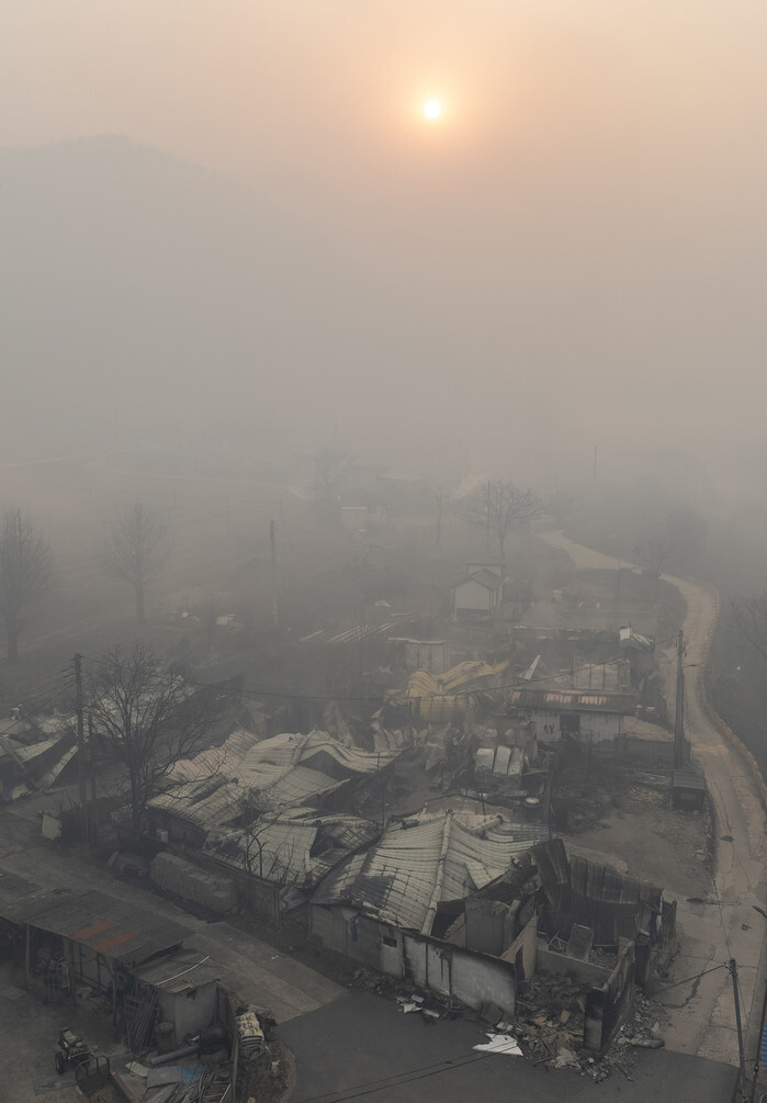 The sun rises above a destroyed village in Yeongyang, North Gyeongsang Province, southeastern South Korea, on March 26, 2025, after the region was ravaged by a wildfire the previous day. (Yonhap)