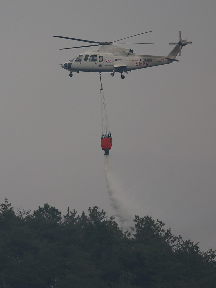 Firefighting operations continue as a wildfire burns in Yeongyang, North Gyeongsang Province, southeastern South Korea, on March 28, 2025. (Yonhap)
