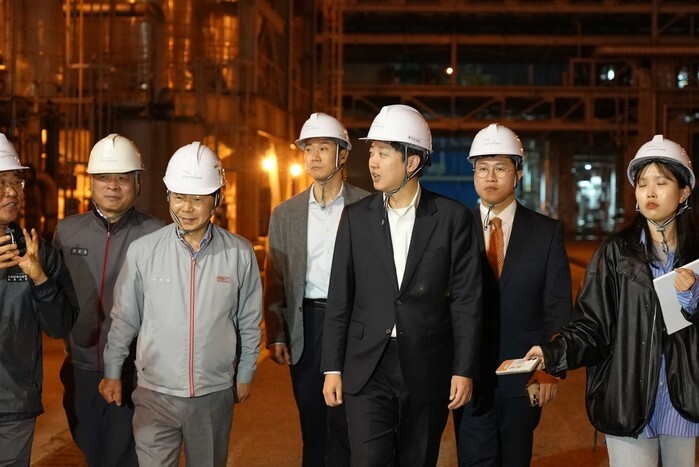 Lee Jun-seok (C), the presidential candidate of the minor conservative New Reform Party, tours a plant of Kumho P&B Chemicals Inc. in Yeosu, South Jeolla Province, southwestern South Korea, on May 12, 2025, as the 22-day official campaign period for the June 3 presidential election begins with seven hopefuls vying for the top elected office, in this photo released by the party. (PHOTO NOT FOR SALE) (Yonhap)