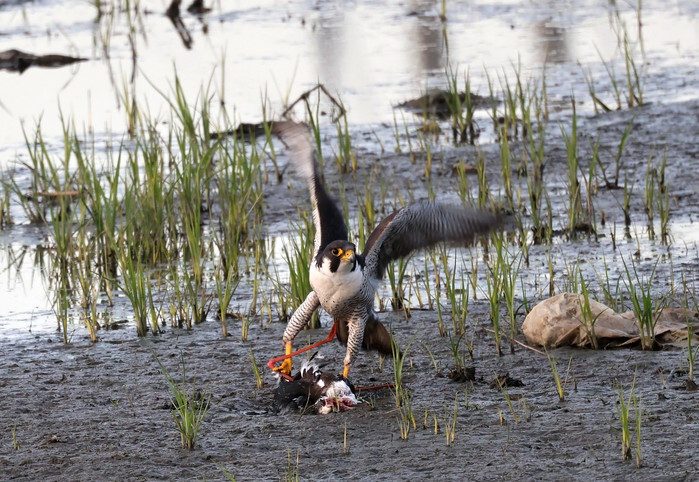 A hawk holds a black-winged stilt in its talons along a stream in Gangneung, Gangwon Province, northeastern South Korea, on April 27, 2025. The hawk, an endangered animal, is designated as a natural monument of the country. (Yonhap)