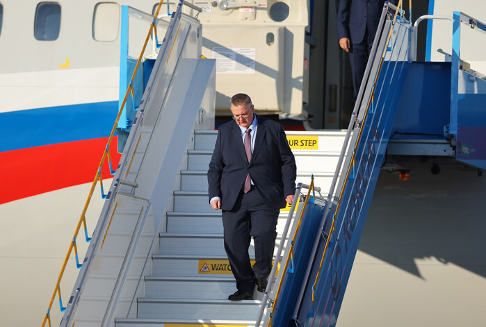 Russian Deputy Prime Minister Alexey Overchuk arrives at Gimhae airport in the southeastern port city of Busan on Oct. 29, 2025, to attend this year's summit of the Asia-Pacific Economic Cooperation forum in the nearby city of Gyeongju. (Yonhap)