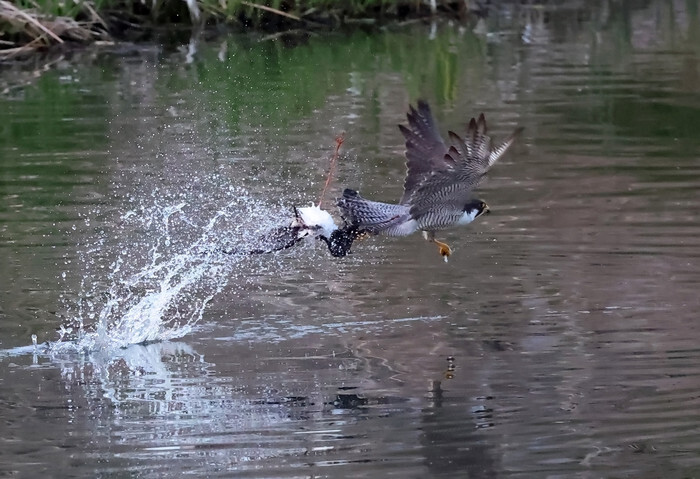 A hawk snatches a black-winged stilt from a stream in Gangneung, Gangwon Province, northeastern South Korea, on April 27, 2025. The hawk, an endangered animal, is designated as a natural monument of the country. (Yonhap)