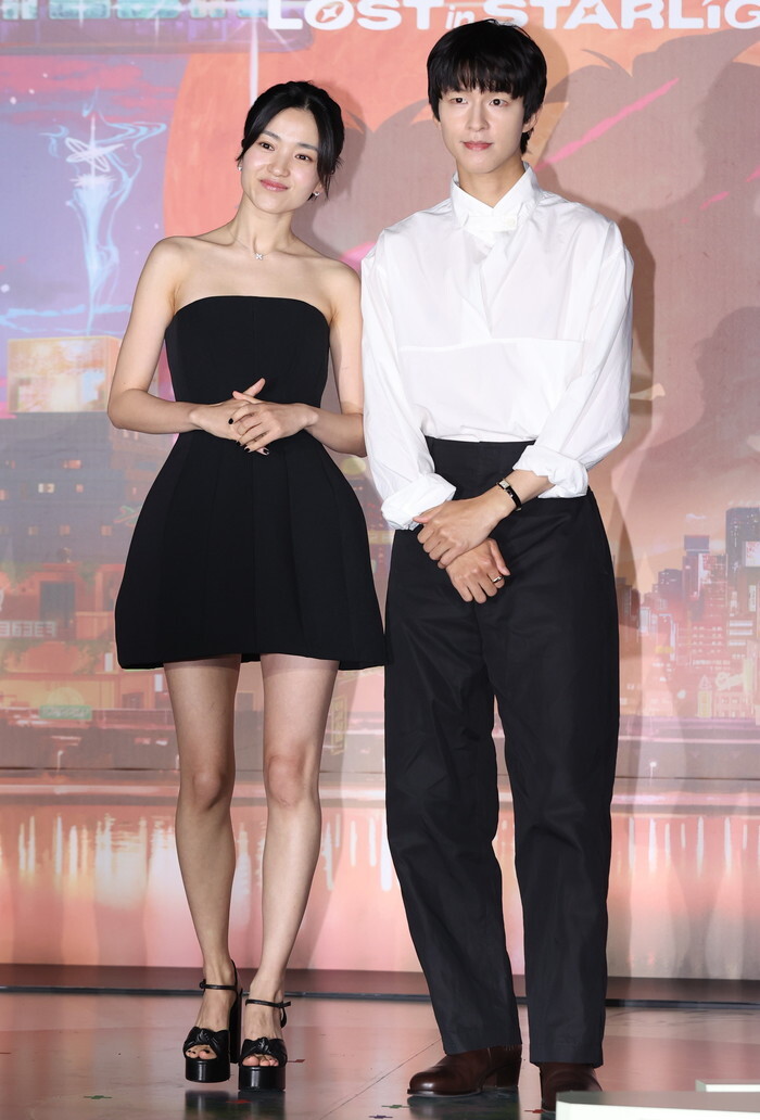 South Korean actress Kim Tae-ri and actor Hong Kyung, who who voiced characters in Netflix's first Korean animated movie "Lost in Starlight," pose for a photo during a publicity event in Seoul on May 27, 2025. The animated movie will be released worldwide on May 30. (Yonhap)