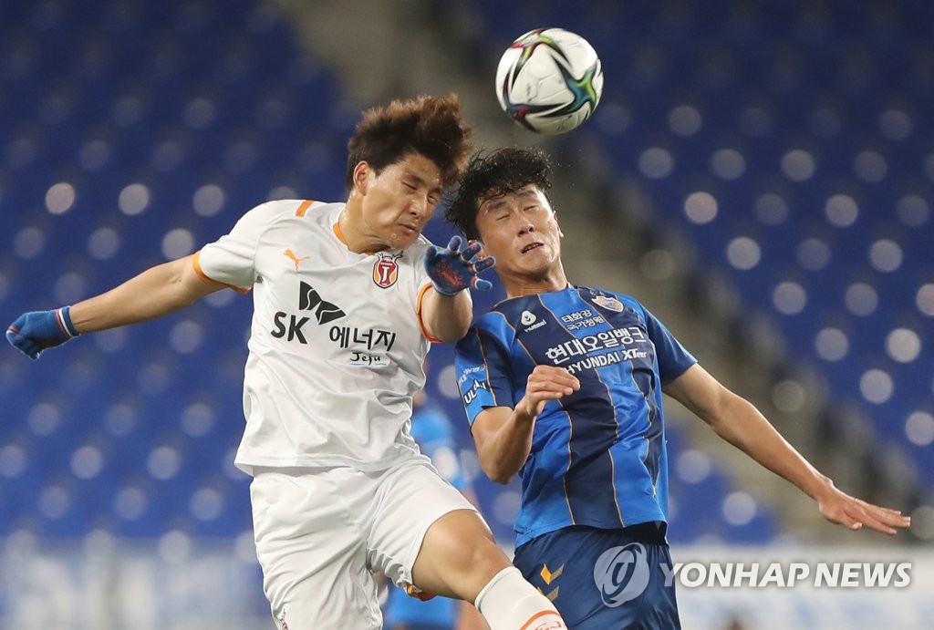 | ▲ Joo Min-kyu of Jeju United (L) and Won Du-jae of Ulsan Hyundai FC vie for the ball during their K League 1 match at Ulsan Munsu Football Stadium in Ulsan, 415 kilometers southeast of Seoul, on March 16, 2021. (Yonhap) |