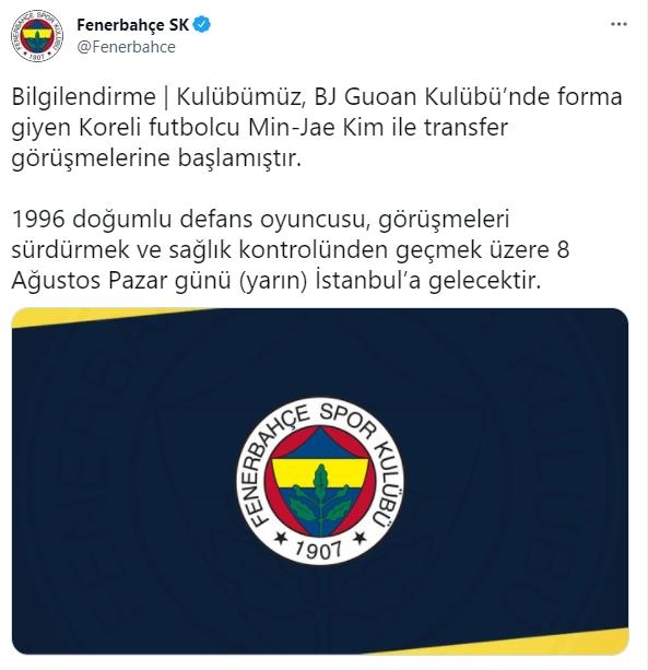페네르바체는 8일(한국시간) 공식 소셜미디어(SNS) 계정을 통해 "베이징 궈안에서 뛰는 김민재와 이적 협상을 시작했다"라며 "김민재는 8일 이스탄불에 도착해 협상을 계속하고 메디컬 테스트를 받을 예정"이라고 밝혔다.